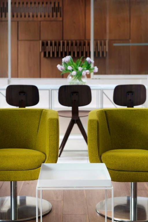 Ο χώρος των 110m2 είναι σχεδιασμένος σαν ένα ξύλινο κουτί κατά παραγγελία, ενώ η νοσταλγία της δεκαετίας του ’70 προκλήθηκε μέσα από την υλικότητα: καπλαμάς καρυδιάς, κόντρα πλακέ σημύδας και χειροποίητο terrazzo.