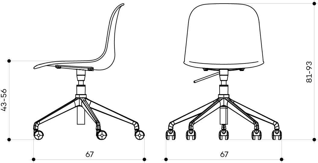 Διαστάσεις: ύψος 81 – 93cm – ύψος καθίσματος 43 – 56cm – πλάτος 67cm – βάθος 67cm