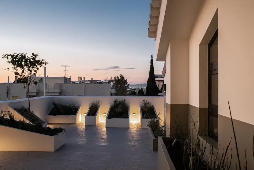 Στον εξωτερικό χώρο χρησιμοποιήθηκαν πηγές με επαρκή φωτισμό και κύριο μέλημα να μην δημιουργείται φωτορύπανση, δημιουργώντας ένα χαλαρό περιβάλλον και τονίζοντας ταυτόχρονα αρχιτεκτονικές λεπτομέρειες του κτιρίου.