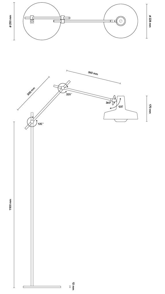 Διαστάσεις: διάμετρος βάσης D 25cm – μήκος σταθερού στελέχους L 109cm – μήκος μεσαίου βραχίονα L 30cm – μήκος βραχίονα διαχύτη L 34cm – διάμετρος διαχύτη D 22.8cm.