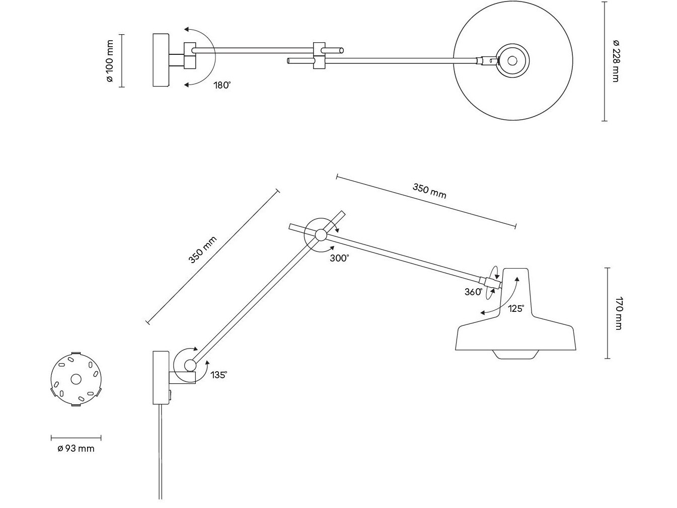 Διαστάσεις: διάμετρος βάσης D 10cm – μήκος βραχίονα βάσης L 35cm – μήκος βραχίονα διαχύτη L 35cm – διάμετρος διαχύτη D 22.8cm.